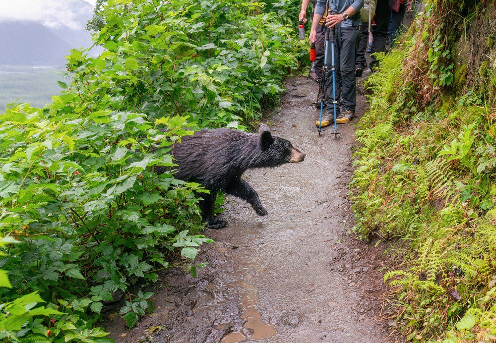 Orso che cammina davanti agli escursionisti che tengono spray per orsi su un sentiero Parco nazionale di Kenai Fjords, Alaska