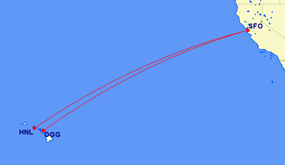 Hawaiian Airlines opera voli diretti per le isole hawaiane di Oahu (Honolulu) e Maui (Kahului), entrambe con servizi giornalieri. Il collegamento diretto tra Honolulu e San Francisco è servito con l’aereo Airbus A330-200 widebody della compagnia aerea, rispetto a quello da Kahului a San Francisco, che vede schierato il più piccolo Airbus A321.