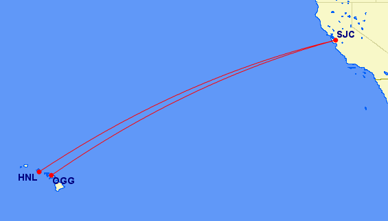 , California, vengono servite due rotte per le Hawaii: Honolulu e Kahului. Hawaiian Airlines mantiene un servizio giornaliero a bordo del vettore Airbus A321 da SJC a HNL, mentre il collegamento a Kahului viene servito per sei settimane (tutti i giorni tranne la domenica).