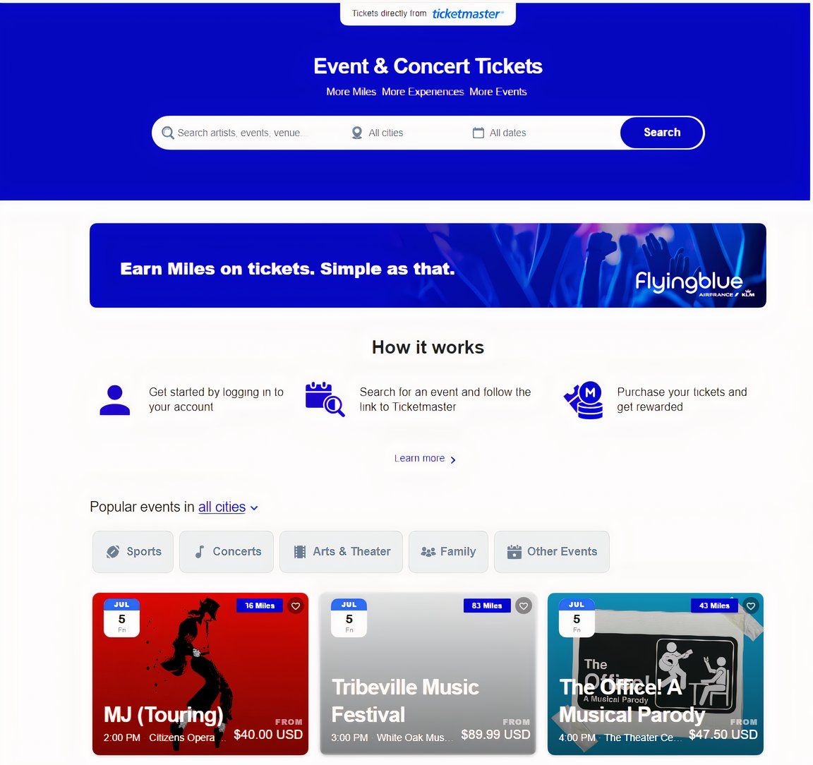 American Airlines AAdvantage offre probabilmente le opzioni più ampie per guadagnare dai biglietti dei concerti. Esiste una partnership con Ticketmaster, che offre l'accumulo di miglia AAdvantage sull'acquisto di biglietti per eventi negli Stati Uniti e in Canada. Questo deve essere fatto attraverso un portale AAdvantage Events dedicato. Questi acquisti guadagnano anche punti fedeltà, contribuendo al raggiungimento dello status d'élite,