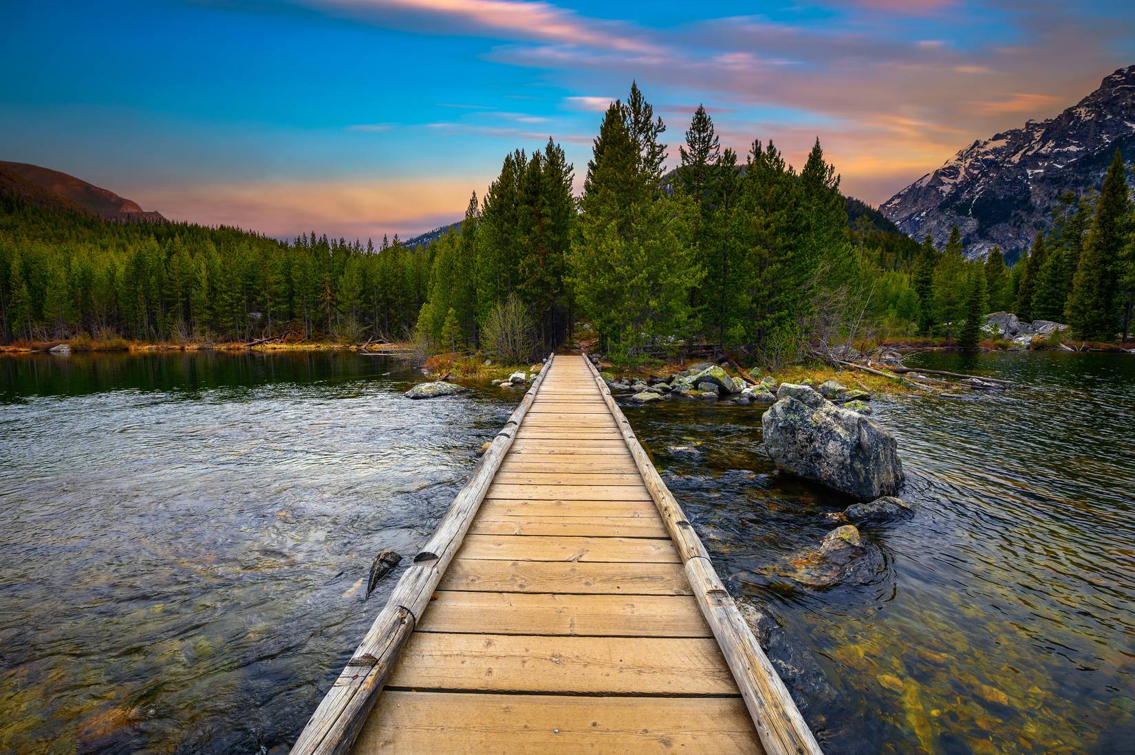 Un ponte pedonale sul lago Taggart sul Taggart Lake Trail nel Parco Nazionale del Grand Teton, Wyoming, WY, USA