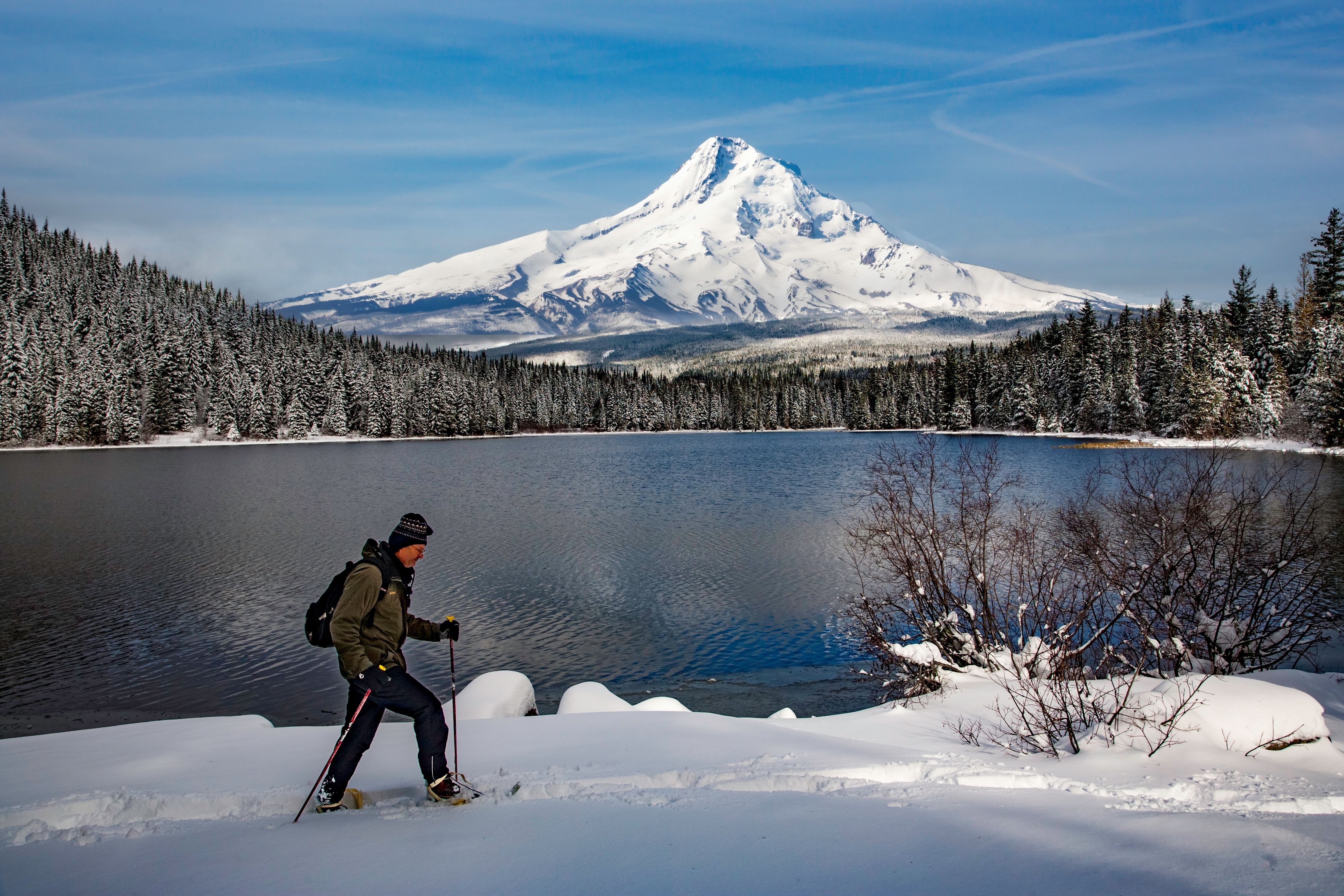 Un uomo con le racchette da neve lungo il lago Trillium con il Monte Hood sullo sfondo vicino a Government Camp, Oregon