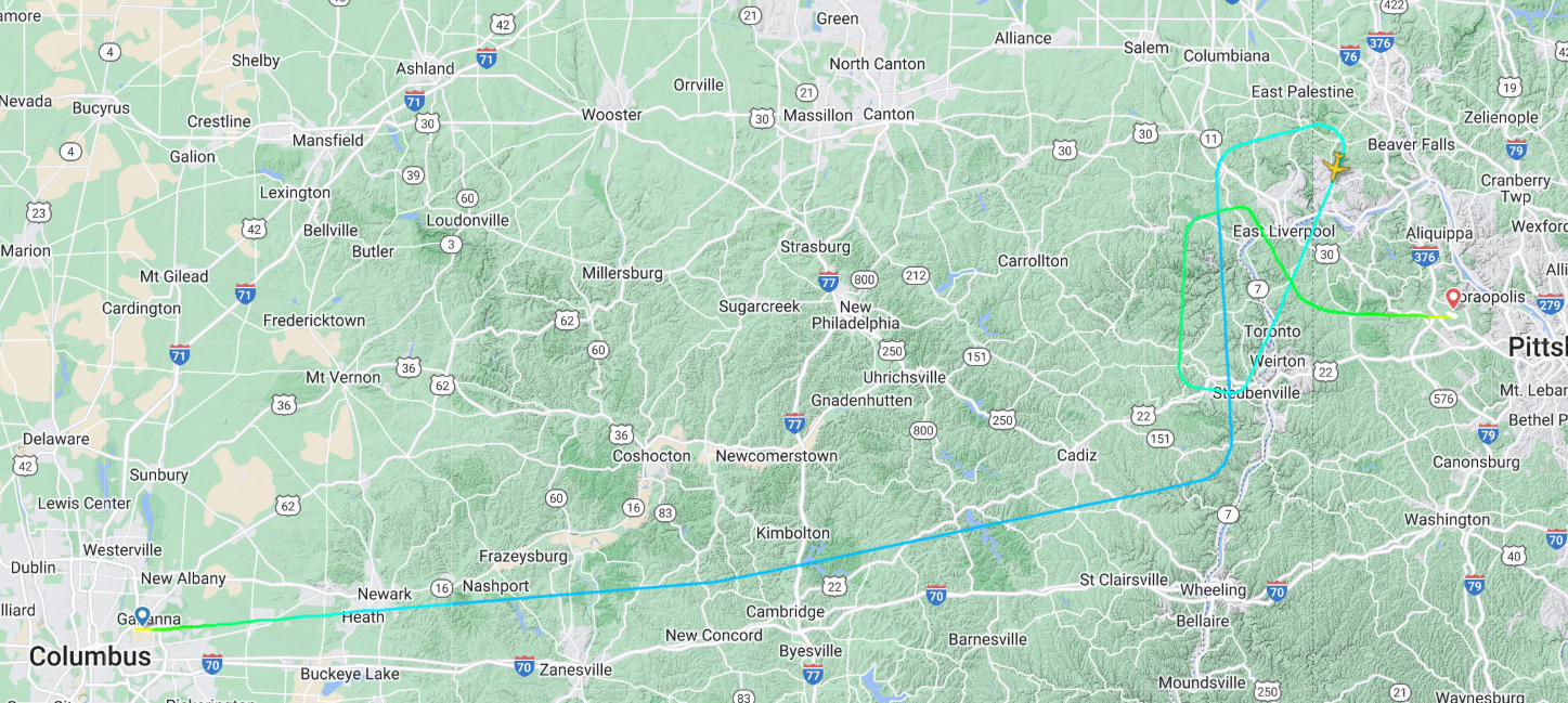 SecondoFlightradar24, l'Embraer E175 decollò in direzione est, salendo ad un'altitudine di poco più di 13.000 piedi prima di essere, secondo quanto riferito, colpito da un fulmine. Osservando i dati di volo, il pilota ha preso una rapida decisione sopra i cieli di Wheeling, West Virginia, e ha virato a nord prima di sorvolare Toronto e East Liverpool, Ohio, prima di deviare su