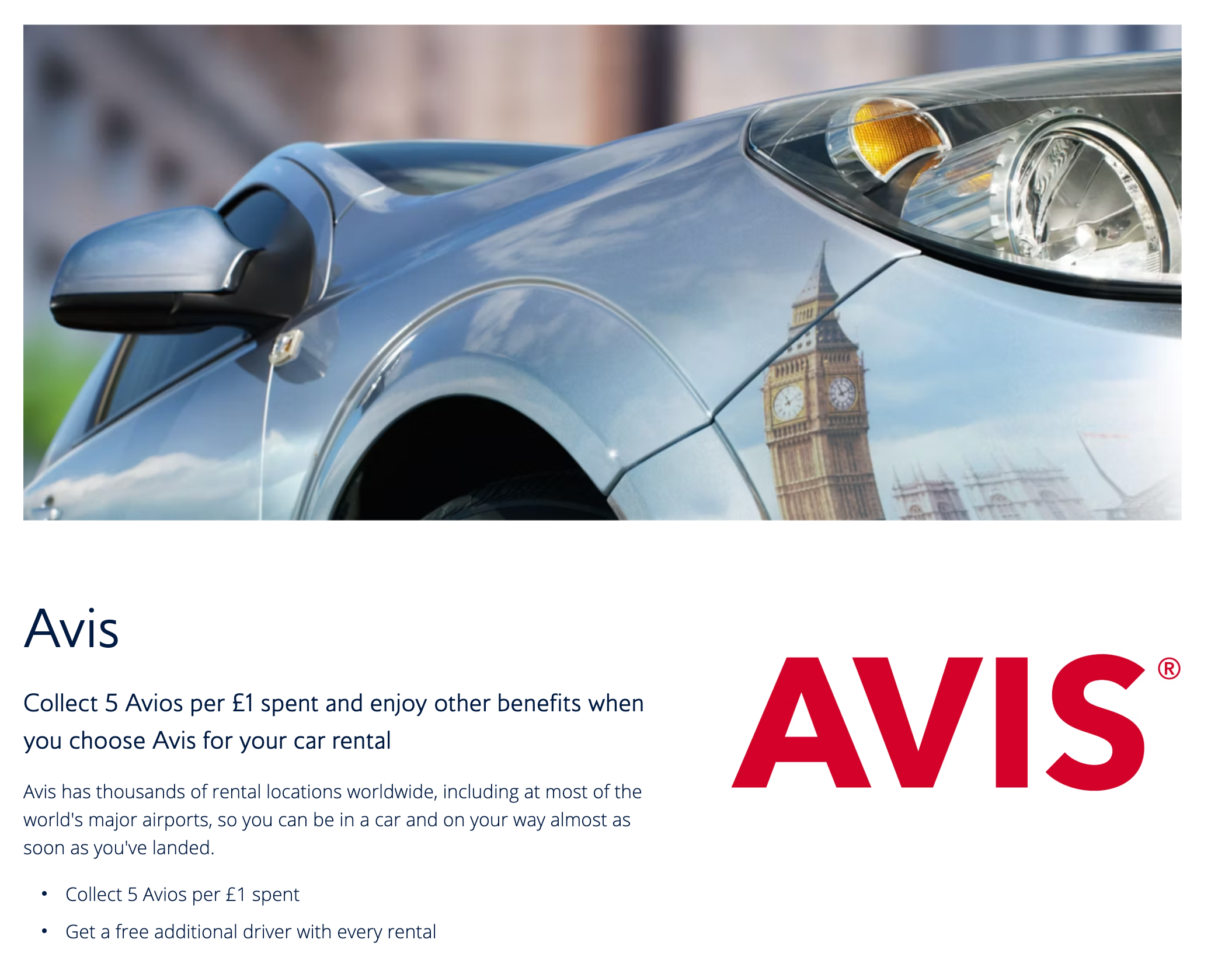 Oltre a ottenere punti Avios per fare il pieno di benzina alla tua auto (se richiedi la carta Visa Signature, ovviamente) puoi anche ottenere Avios anche quando noleggi un'auto. Avios collabora con le società di autonoleggio Avis e Budget, con vari gradi di generosità.