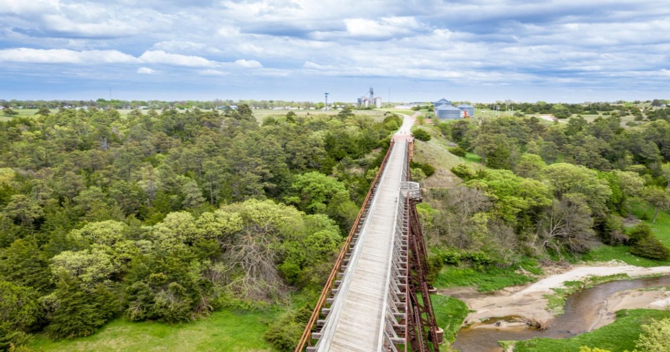 Il multiuso ricreativo Cowboy Trail nel Nebraska settentrionale, una veduta aerea di un lungo traliccio su Long Pine Creek