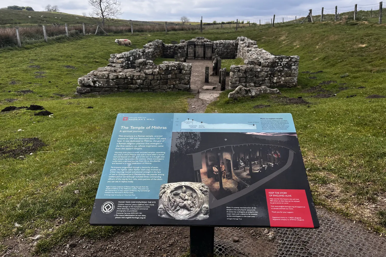 Da Housesteads, il sentiero prosegue lungo la zona collinareCrags di Sewingshieldsper altri 2,5 chilometri prima di appiattirsi, dando una pausa alle gambe fino alTempio di Mitra. Questo tempio è un'eccezionale rovina che mostra le pratiche religiose simili al culto dei soldati romani lungo il muro. Puoi osservare le basi dei pilastri di pietra, i muri di fondazione e un santuario dove alcuni visitatori hanno lasciato offerte. Nell'adiacente parcheggio Brocolitia, un furgone vende caffè, tè e dolcetti.