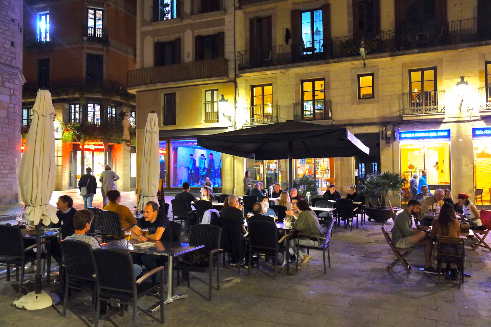 La gente si siede di notte in un bar sul marciapiede nel quartiere El Born di Barcellona, SpagnaCredito: Tupungato / Shutterstock.com