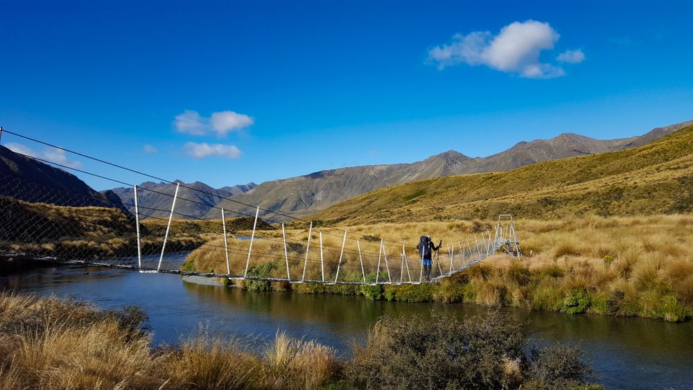 Escursionista che attraversa un ponte sospeso sul Te Araroa Trail, Nuova Zelanda