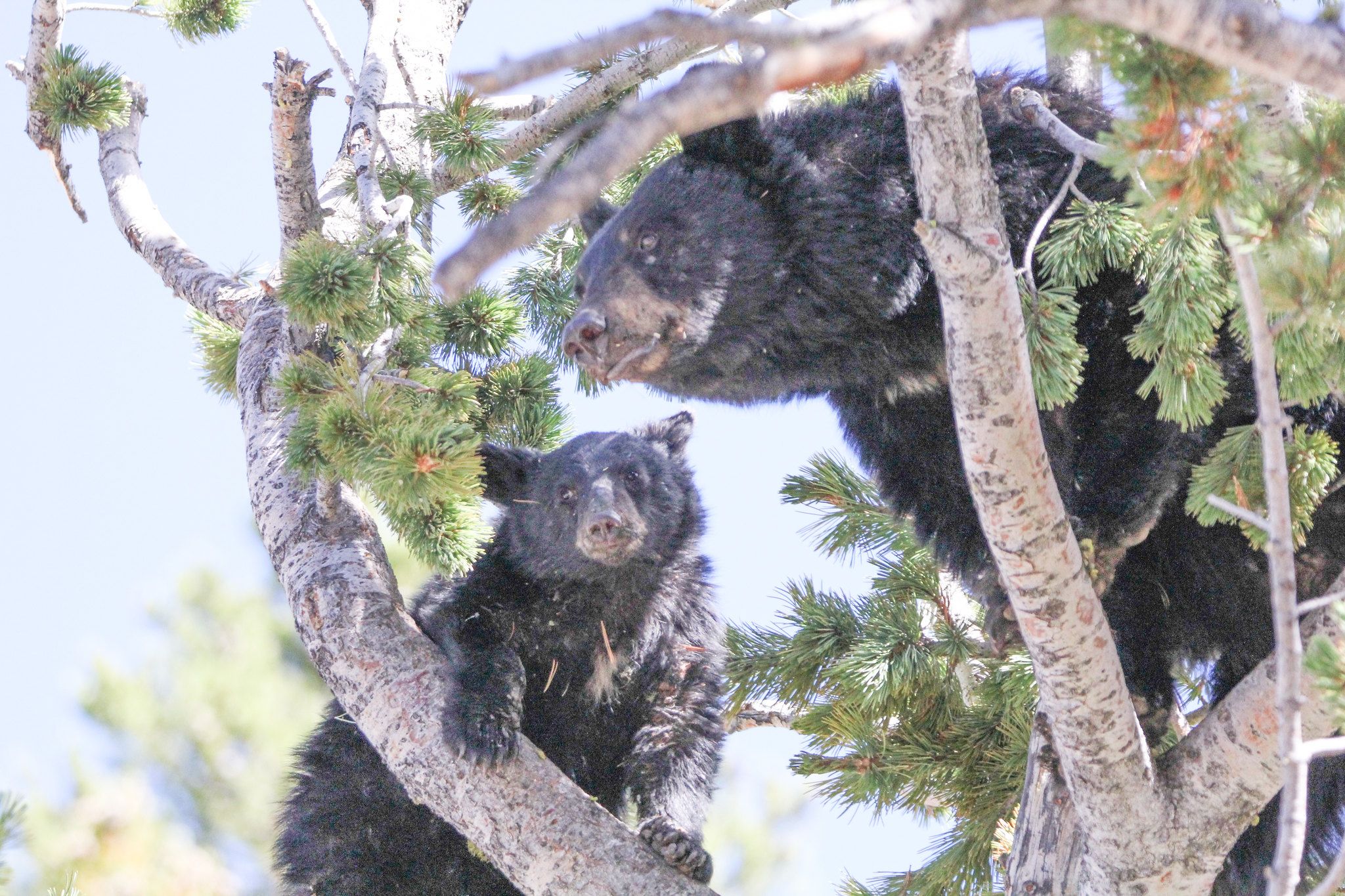 Orsi neri su un albero nel Parco Nazionale di Yellowstone, USA