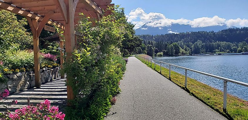 Veduta del marciapiede con il lago sulla destra a Scoop, British Columbia, via Trina Barnes / shutterstock.com
