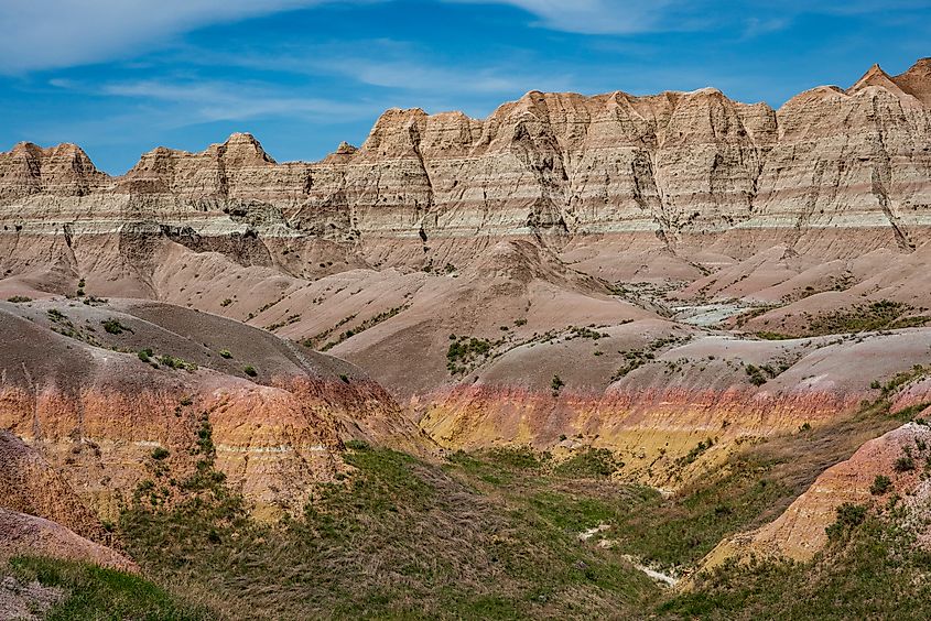 Rocce aride, creste e scogliere nelle aspre Badlands del South Dakota.