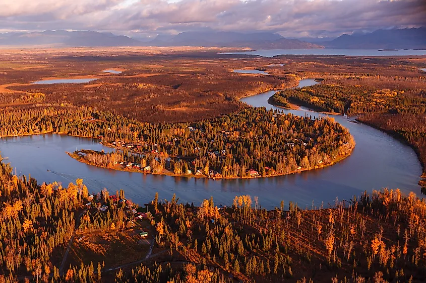 Veduta aerea del colore autunnale lungo il fiume Kenai sulla penisola di Kenai in Alaska.