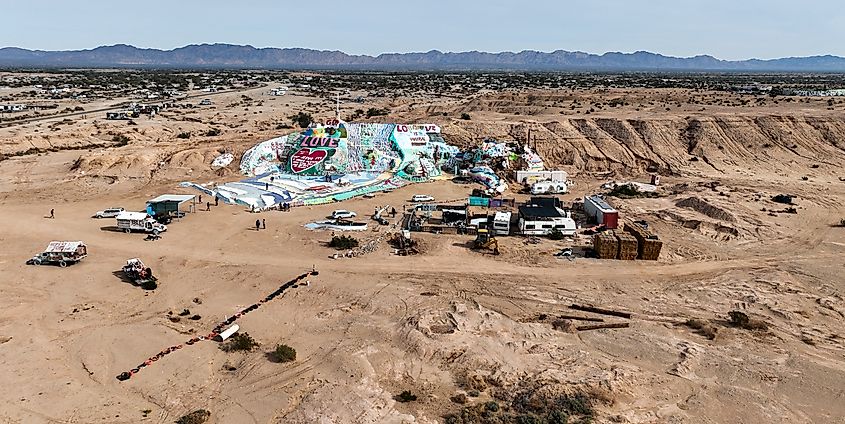 Slab City non ha acqua né elettricità e i residenti vivono in strutture improvvisate costruite con lastre di cemento abbandonate. Migliaia di uccelli invernali cercano rifugio a Slab City per le sue temperature più calde, aumentando la popolazione in inverno. I residenti hanno costruito la Salvation Mountain dall’aspetto strano, che presenta una finta montagna colorata alta 50 piedi ricoperta di coloratissima arte popolare e incisa con messaggi di compassione di Dio.