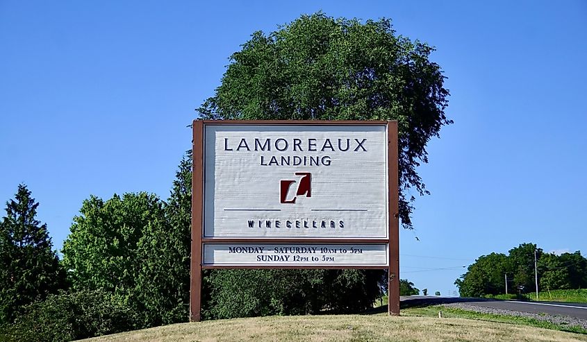 Segnaletica delle cantine vinicole Lamoreaux Landing, situate sul lato orientale del Lago Seneca. Credito immagine PQK tramite Shutterstock.com