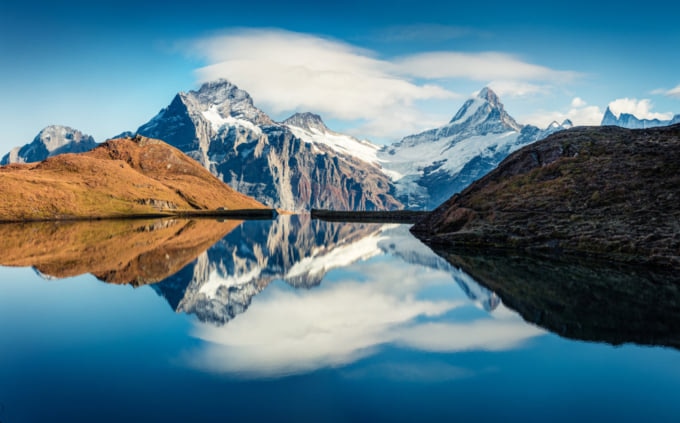 Questo bellissimo lago glaciale è un'escursione relativamente facile dalla pittoresca cittadina svizzera di Grindelwald. La pittoresca acqua limpida qui crea immagini incredibili quando il lago si ferma e trattiene il riflesso delle spettacolari cime circostanti.