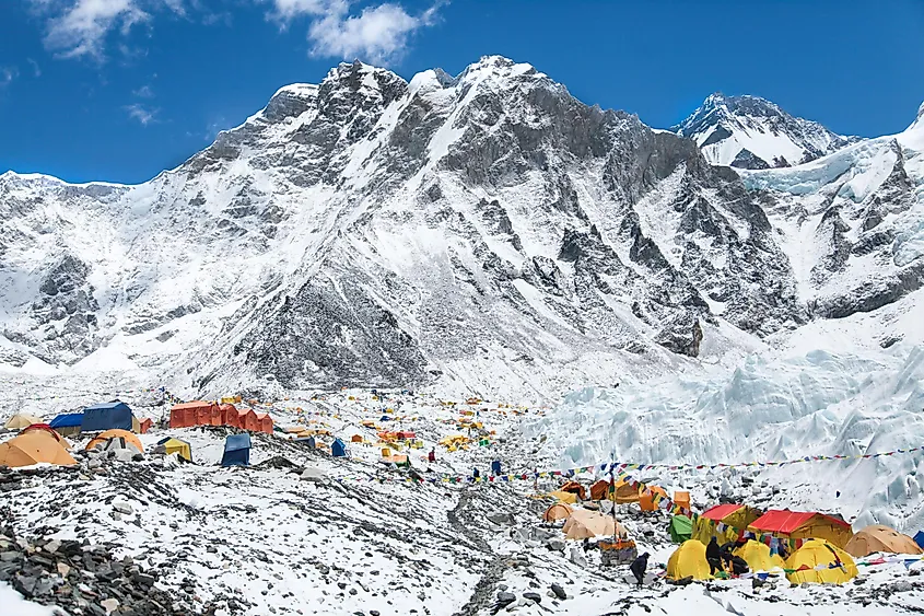 Tende degli alpinisti al campo base dell'Everest in Nepal.