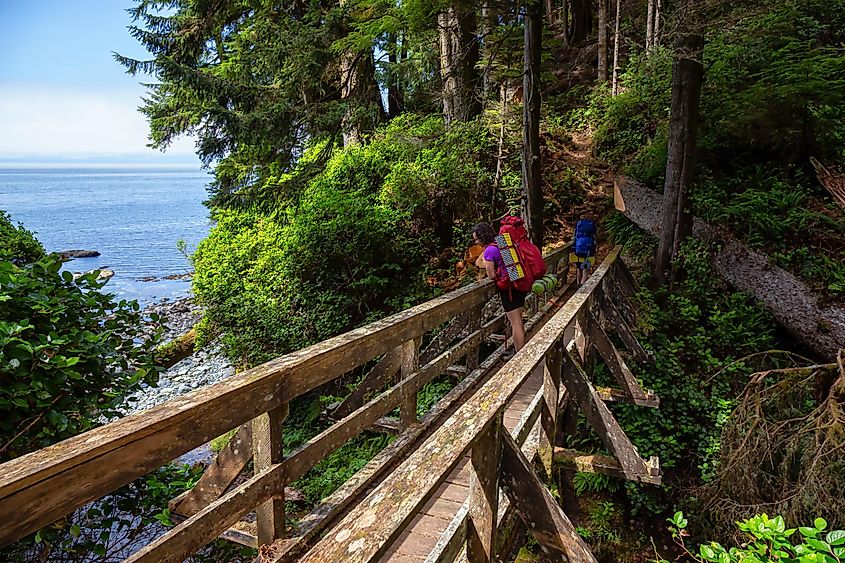 Lungo la costa sud-occidentale dell'isola di Vancouver, nella Columbia Britannica, il West Coast Trail si estende per 47 miglia (75 km) fradicie e impegnative attraverso la foresta pluviale della Pacific Rim National Park Reserve. Questo trekking irripetibile combina sentieri naturalmente usurati, per gentile concessione delle prime nazioni della regione, e una via di uscita artificiale per i marinai naufraghi che venivano a riva così frequentemente che questa costa minacciosa divenne nota come "il cimitero del Pacifico". Gli escursionisti di oggi devono fare i conti con gli orari spesso incessanti della pioggia e delle maree. Le sfide lungo il percorso includono anche la salita o la discesa di 100 scale di legno, attraversamenti fluviali in funivia (o i buoni attraversamenti fluviali non assistiti vecchio stile), rocce e radici scivolose e occasionali avvistamenti di orsi neri. Tutto ciò rende il WCT un'esperienza lenta, ma fa tutto parte dell'avventura. Come ricompensa per i tuoi sforzi, aspettati di rimanere abbagliato dall'enorme vegetazione, dalle spiagge selvagge, dalle grotte marine, dagli archi di roccia, dai branchi di balene grigie e dai considerevoli raduni di leoni marini.