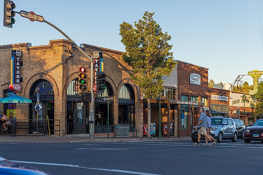 Scena di strada del centro di Flagstaff nel tardo pomeriggio. Crediti editoriali: Framalicious / Shutterstock.com
