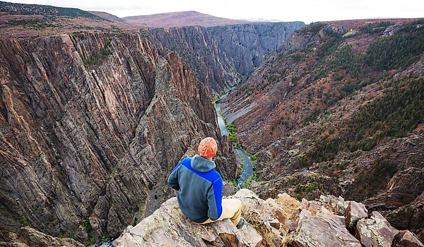 Turista sulle scogliere di granito del Canyon Nero del Gunnison, Colorado.