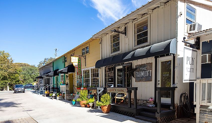 I piccoli negozi di Wimberley Square. Credito immagine Roberto Galan tramite Shutterstock.