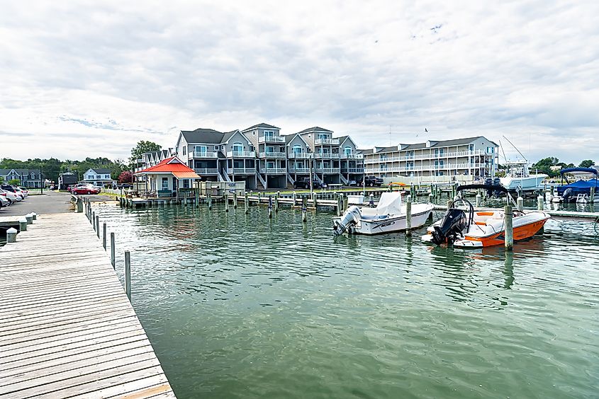Edifici allineati lungo la costa a Chincoteague, Virginia. Credito immagine Kosoff tramite Shutterstock