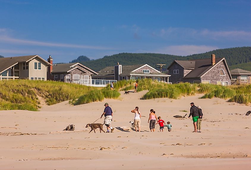 Una giornata di sole sulla costa dell'Oregon, con persone che si godono la spiaggia di Manzanita, Oregon, Stati Uniti. Credito editoriale: Rob Crandall / Shutterstock.com