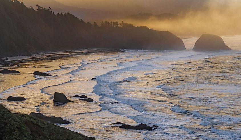Mattinata nebbiosa presso la Baia di Ecola State Park vicino a Cannon Beach sulla costa dell'Oregon