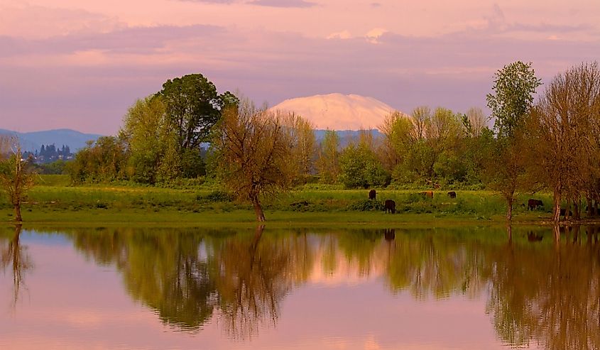 Riflessione del Monte Saint Helens con mucche che pascolano sull'acqua nell'isola di Sauvie durante il tramonto