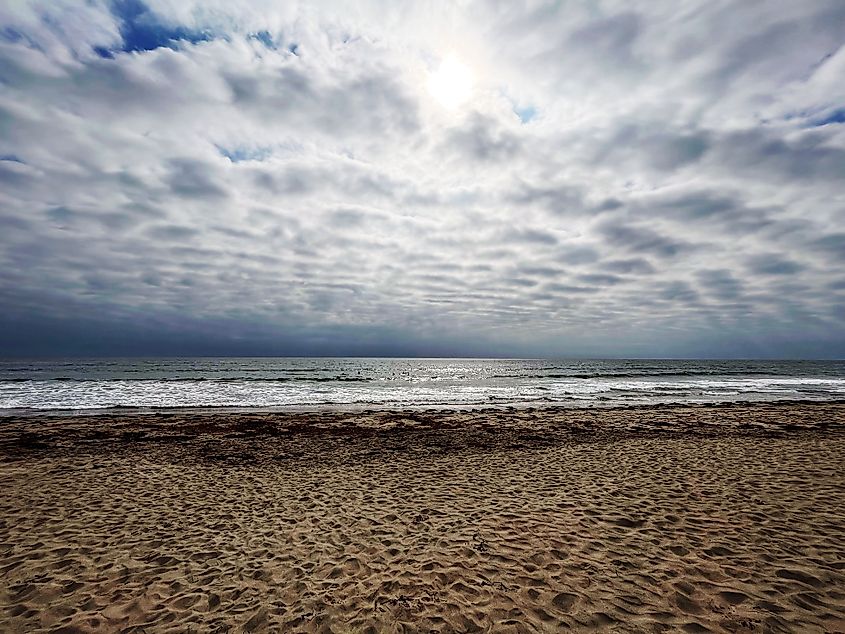 Sabbia e schiuma oceanica sotto un cielo nuvoloso sulla spiaggia della Martinica a Petpeswick, Nuova Scozia.