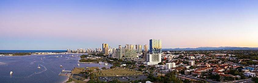 Panorama di Southport e Gold Coast Broadwater al crepuscolo, Queensland, Australia.
