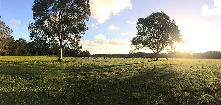 Il sole che tramonta nel Coombabah Lake Conservation Park con i canguri sullo sfondo. Di Kainazmanekshaw – Opera propria, CC BY-SA 4.0,Wikipedia.