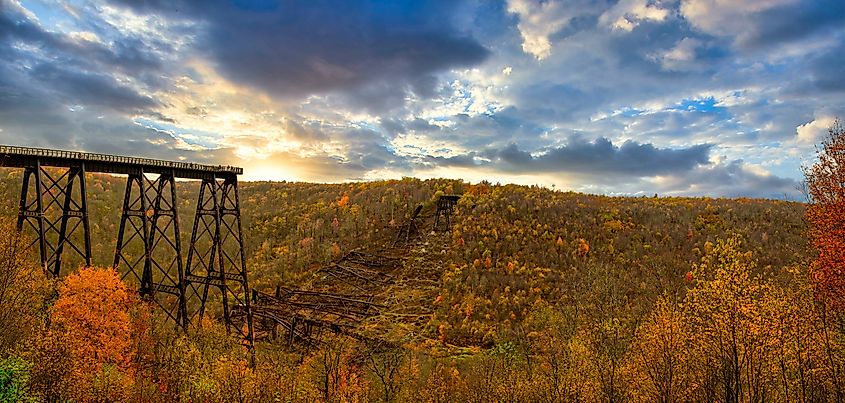 Kinzua Bridge State Park, dove attendono i resti dello storico viadotto Kinzua, un tempo il ponte ferroviario più lungo e alto del mondo. Parzialmente distrutto da un tornado nel 2003, il ponte è ora una passerella panoramica che offre viste mozzafiato sulla gola Kinzua. Il centro visitatori del parco offre una panoramica della storia e del significato del viadotto. Nel frattempo, i sentieri naturalistici della zona ti condurranno nella foresta per ulteriori punti panoramici sulla gola.