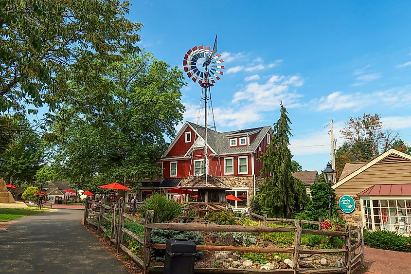 Da Filadelfia al Peddler's Village nella contea di Bucks, guiderai per quasi un'ora, percorrendo circa 44 miglia prima di raggiungere il bizzarro villaggio. Mentre lasci Filadelfia, considera di fermarti nella storica città di New Hope. Situata lungo il fiume Delaware, New Hope è piena di boutique, gallerie d'arte e negozi di antiquariato. Se sei lì nel fine settimana, la New Hope & Ivyland Railroad propone viaggi panoramici in treno attraverso la campagna della regione. Non lontano da New Hope, dirigiti al Bucks County Playhouse, un teatro iconico noto per le sue produzioni teatrali professionali. È un classico pezzo di storia locale, originariamente un mulino risalente al 1790. Anche se non assisti a uno spettacolo, l'edificio e l'area circostante meritano una breve passeggiata per il loro fascino e le viste incredibili.