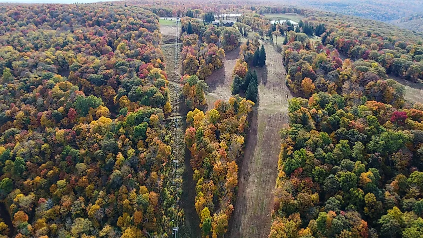 Il fogliame autunnale costeggia le piste da sci della stazione sciistica di Laurel Mountain a Ligonier, Pennsylvania.