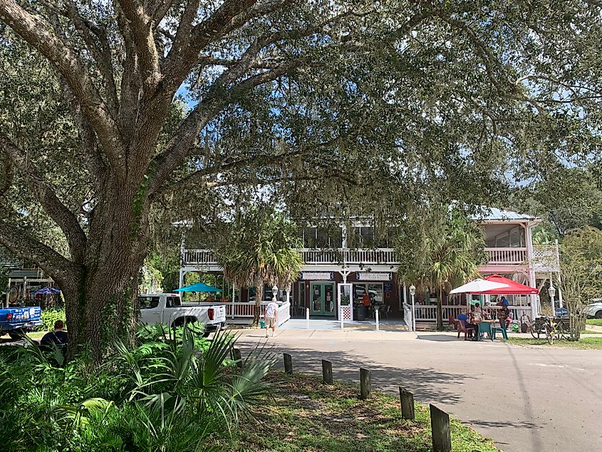 Negozi e ristoranti sono aperti al pubblico lungo il litorale del Golfo del Messico a Cedar Key, in Florida. Credito editoriale: Leigh Trail / Shutterstock.com