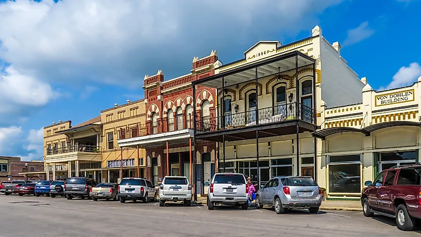 Tipici edifici del Texas sulla piazza della città di Goliad, Texas. Credito immagine Philip Arno Photography tramite Shutterstock