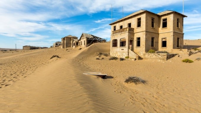 Kolmanskop un tempo era una fiorente città mineraria di diamanti in Namibia, che vantava lussuose case in stile tedesco, un ospedale, una centrale elettrica, una fabbrica di ghiaccio, una piscina e persino un cinema. Tuttavia, dopo che i diamanti furono esauriti, la città fu abbandonata nel 1954, diventando la città fantasma che è oggi. Ora sepolto parzialmente nella sabbia, è diventato una popolare attrazione turistica in Namibia.