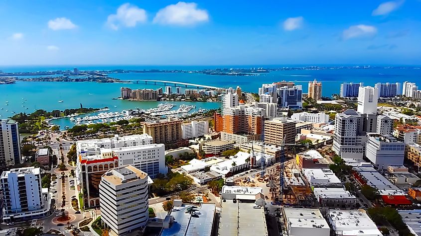 Splendida vista aerea panoramica del centro di Sarasota, della John Ringling Causeway, della Baia di Sarasota, di Lido Key e di Longboat Key