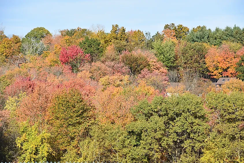 La Cornovaglia può essere conosciuta come la “città più verde del Connecticut”, ma in autunno le sue colline esplodono in un caleidoscopio di colori. Situata lungo il fiume Housatonic e le montagne del Berkshire, la città è la porta d'accesso ad alcuni dei parchi più belli del Connecticut. La Mohawk State Forest è particolarmente abbagliante in questo periodo dell'anno, con la Mohawk Mountain in fiamme con alberi dorati, rossi e arancioni. Nel 2025, la Foliage Map di ExploreFall stima che metà-fine ottobre sia il momento migliore per vedere le foglie della Cornovaglia nella loro massima luminosità.