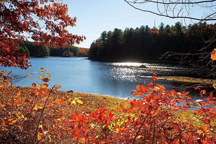 Nel punto più alto del Mohawk State Park, il belvedere di 1.683 piedi offre viste panoramiche sui Berkshire sottostanti, ricoperti dalle sfumature della stagione. A circa 10 minuti a ovest, è possibile ammirare scene spettacolari anche all'Husatonic Meadows State Park. Lungo la strada, attraverserai lo storico ponte coperto della Cornovaglia occidentale, un affascinante punto di riferimento locale incorniciato da alberi dorati in autunno. Successivamente, le escursioni a Housatonic Meadows come il Pine Knob Loop Trail sono un must se desideri la vista migliore. Questo trekking breve ma impegnativo premia gli escursionisti con panorami mozzafiato sopra la valle del fiume punteggiata da alberi.