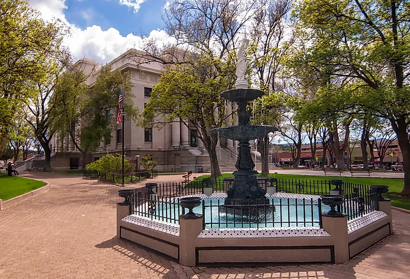 La fontana nella Yavapai County Square con il tribunale sullo sfondo a Prescott, Arizona. Credito immagine: woodsnorthphoto / Shutterstock.com.