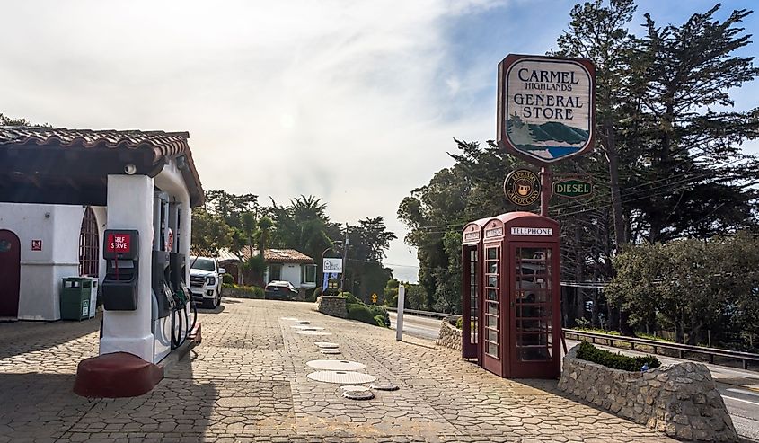 Negozio generale e stazione di servizio Carmel Highlands in stile retrò. Credito editoriale: Victoria Ditkovsky / Shutterstock.com