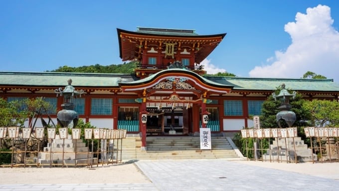 L'accesso al santuario è caratterizzato da una lunga fila di vivaci porte torii rosse conosciute come "Senbon Torii", che creano un percorso che sembra un invito al regno divino. I terreni vantano anche un maestoso grande torii, che lo rende un santuario panoramico da non perdere e un momento indimenticabile del turismo di Yamaguchi.