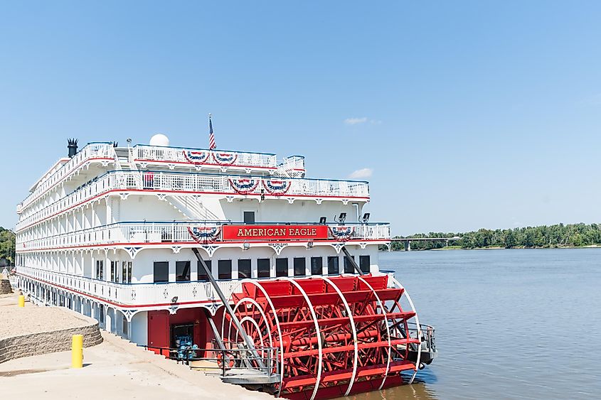 Il battello fluviale con ruota a pale American Eagle è ormeggiato nella storica città natale di Mark Twain ad Hannibal, Missouri. Credito immagine Foto BrianScantlebury tramite Shutterstock