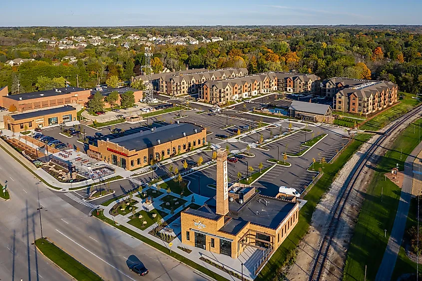 Veduta aerea della zona commerciale e residenziale Spur 16 a Mequon, Wisconsin, Stati Uniti. Credito editoriale: James Meyer / Shutterstock.com