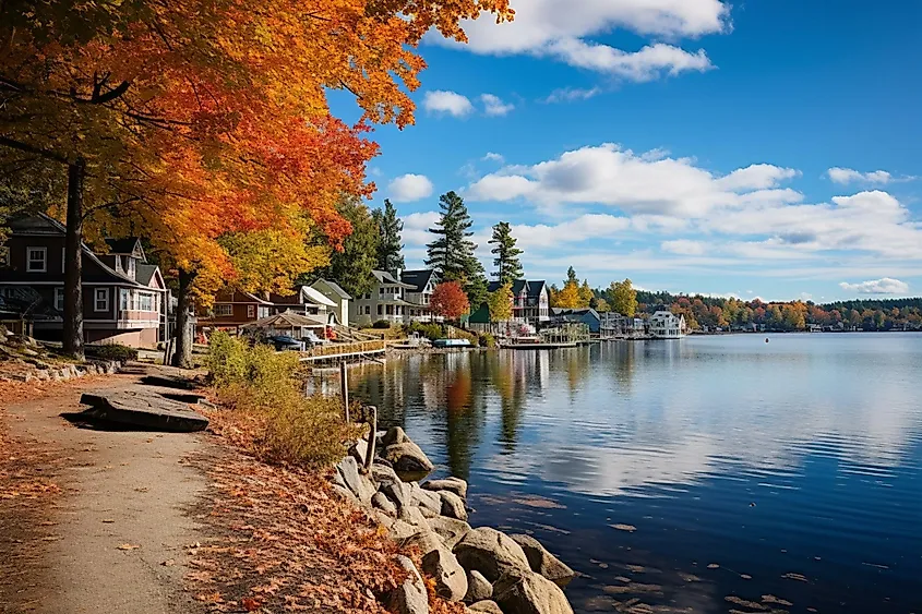 Vista autunnale di Meredith Bay sul lago Winnipesaukee nella storica città di Meredith, New Hampshire.