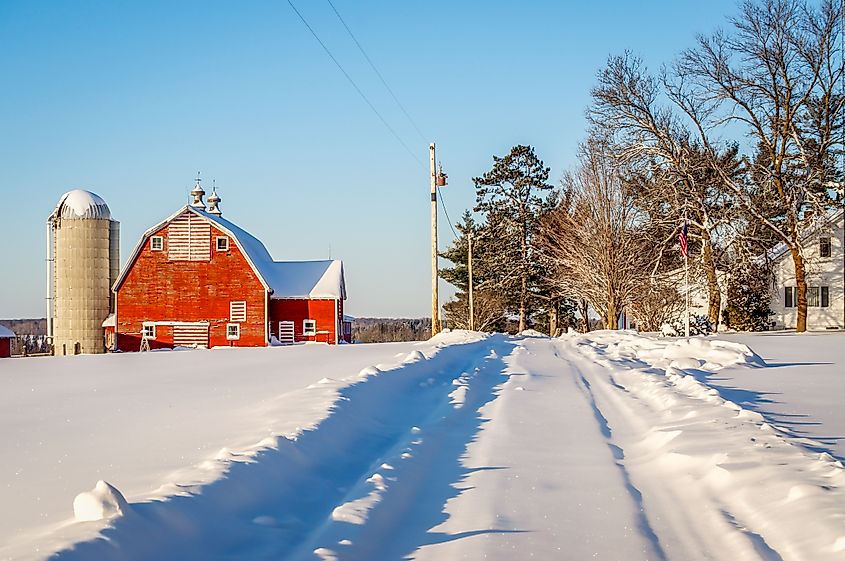 Un sentiero conduce su una collina innevata dove si trovano un fienile rosso e una fattoria bianca vicino a Pequot Lakes, Minnesota.