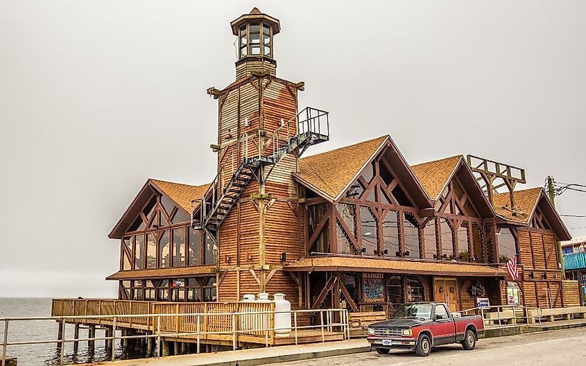 Il ristorante Sea Breeze con uno storico faro nel centro di Cedar Key, Florida. Crediti editoriali: Nick Fox/Shutterstock.com
