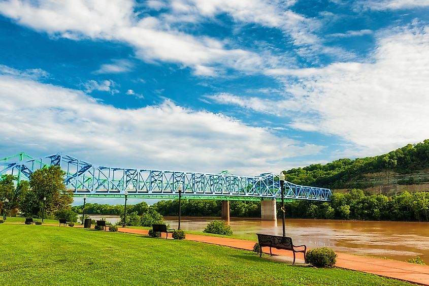 Il fiume Ohio scorre sotto due ponti lungo un parco sul lungomare di Ashland, nel Kentucky
