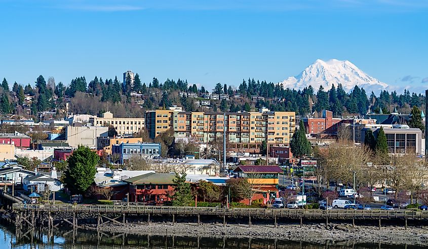 Edifici sul lungomare della città di Olympia, Washington.
